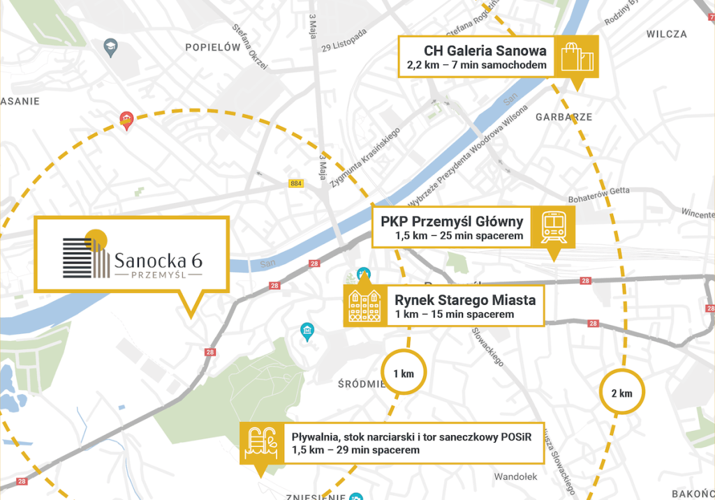 Osiedle znajduje się przy ul. Sanockiej 6 w Przemyślu. To cicha, spokojna i bardzo dobrze skomunikowana okolica –przystanki autobusowe oraz droga krajowa nr 28, przebiegająca przez centrum miasta, znajdują się w bliskiej odległości. Tylko 1,5 km będzie dzielić Cię od dworca PKP i PKS.