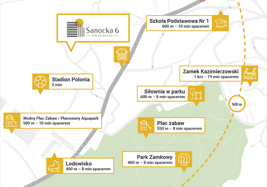 Lokalizacja Sanockiej 6 to przede wszystkim bliskość natury. Tuż obok inwestycji położony jest malowniczy Park Zamkowy im. Mariana Strońskiego z placami zabaw oraz licznymi ścieżkami spacerowymi, co sprzyja rodzinnej rekreacji na świeżym powietrzu. W sąsiedztwie znajdują się także lokalne sklepy, punkty usługowe, paczkomaty oraz restauracje, zapewniając wygodę codziennego życia.